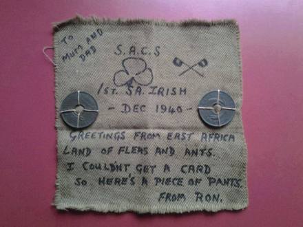The soldier who sent this ‘Christmas Card’ home was Ronald Bidgood, 1st South African Irish, whilst fighting in East Africa during World War 2. Not having much in the way to make a Christmas card in a combat zone, he used a little imagination – his folks must have been quite amused when they received this.