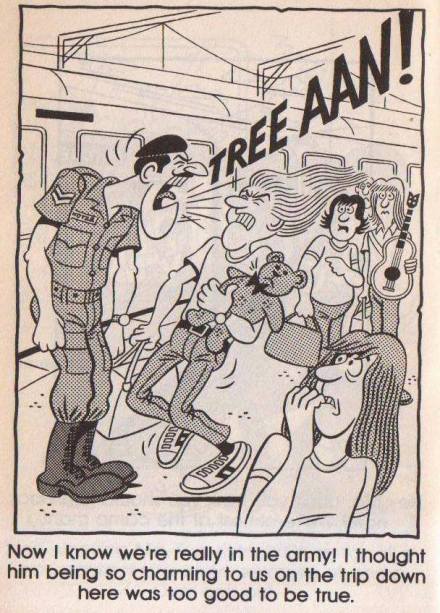 The beginning of the new year in the 1960’s, 1970’s and 1980’s (even the early 1990’s) meant the dreaded “January Intake” and thousands of white South African men would be starting the new year in uniform. This cartoon by Keith and Lorna Stevens in ‘Bytvas’ perfectly captures the surprise awaiting the new national servicemen at their respective intake mustering points.