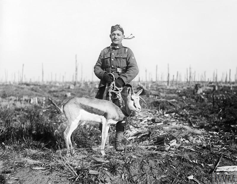 SOUTH AFRICAN FORCES ON THE WESTERN FRONT 1916-1918 (Q 10675) ‘Nancy’, the Springbok mascot of the 4th South African Regiment at the South African Brigade’s memorial service at Delville Wood, 17 February 1918. Copyright: © IWM. Original Source: http://www.iwm.org.uk/collections/item/object/205195294