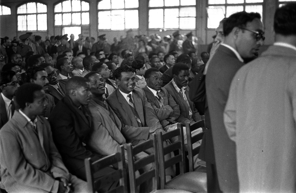 DM2000012412:SAED:SOCIAL:POLITICS:SEP1957 – Treason Trial – Treason trialists inside the Drill Hall, Johannesburg. The trial started on December 19, 1956. As the biggest case in South Africa’s history lumbered to the end of its first stage this August 1957, the 156 accused men and women wondered how many of them would be back in court again. The 156 national leaders had first appeared at a preparatory examination into treason at the end of 1956, in the specially constructd court at the Drill Hall, Johannesburg; they had spent their lives in and out of court for most of 1957; and they could now see the possibility of the same prospect for the third calendar year, 1958, if they were committed for trial in the Supreme Court. (Photograph by Drum photographer BAHA) neg Treason file