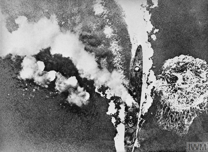 THE BATTLE FOR CRETE, MAY 1941 (HU 1997B) Photograph taken by a German airman recording the sinking of HMS GLOUCESTER off Crete, 22 May 1941. Copyright: © IWM. Original Source: http://www.iwm.org.uk/collections/item/object/205023029