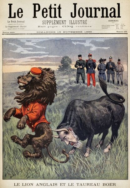 BOER WAR CARTOON, 1899. ‘The English Lion and the Boer Bull.’ The Afrikaner bull, with the head of Paul Krueger, attacks the British lion. French cartoon from a November 1899 issue of ‘Le Petit Journal.’
