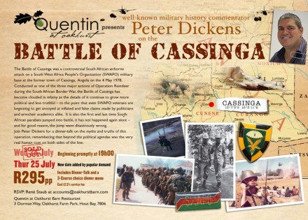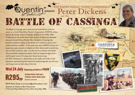 So, do join us for a frank talk on The Battle of Cassinga at Quentin at Oakhurst in Hout Bay on the 25th July. Booking direct with Oakhurst Barn it includes a sit down three course dinner. We really looking forward to exchanging views on this poignant and far-reaching battle.