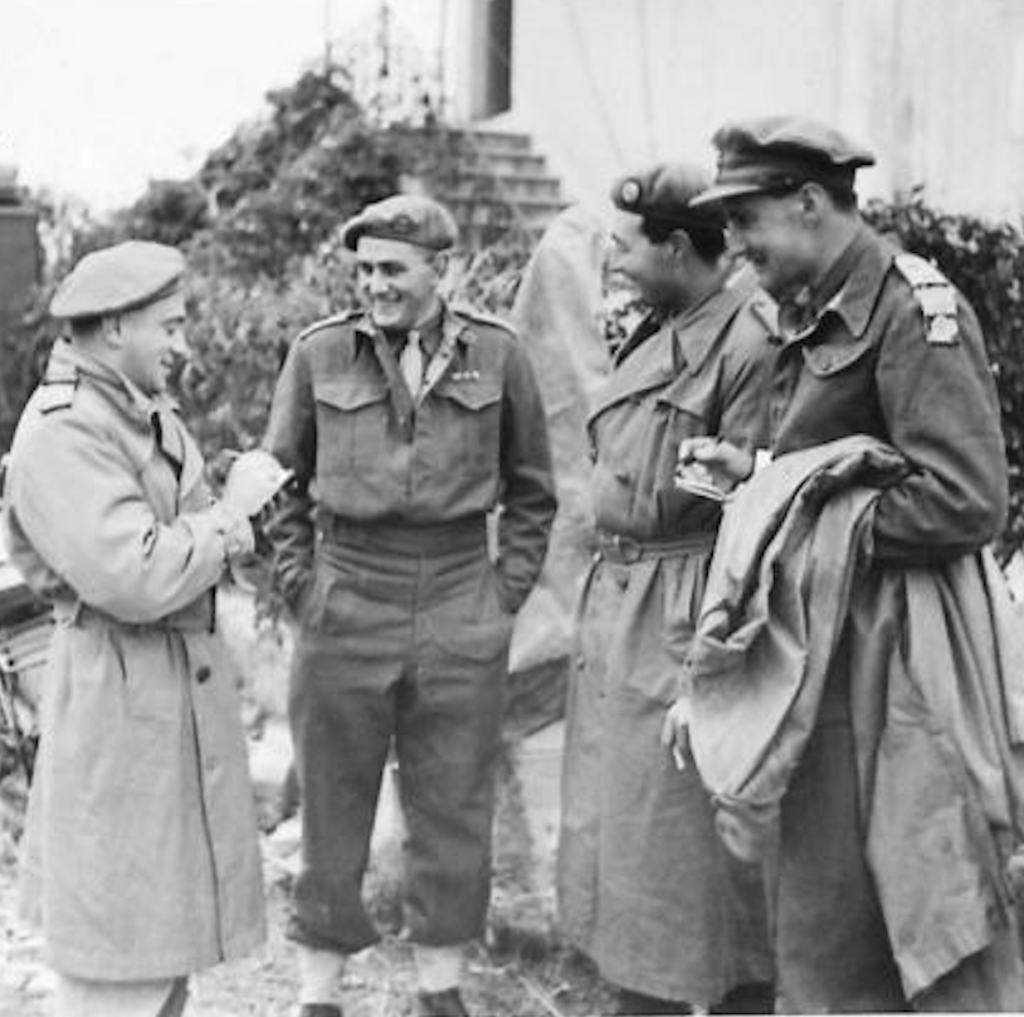 Picture: Lt Gerard Norton in Italy flanked my media on hearing of his successful nomination for a Victoria Cross – Imperial War Museum copyright