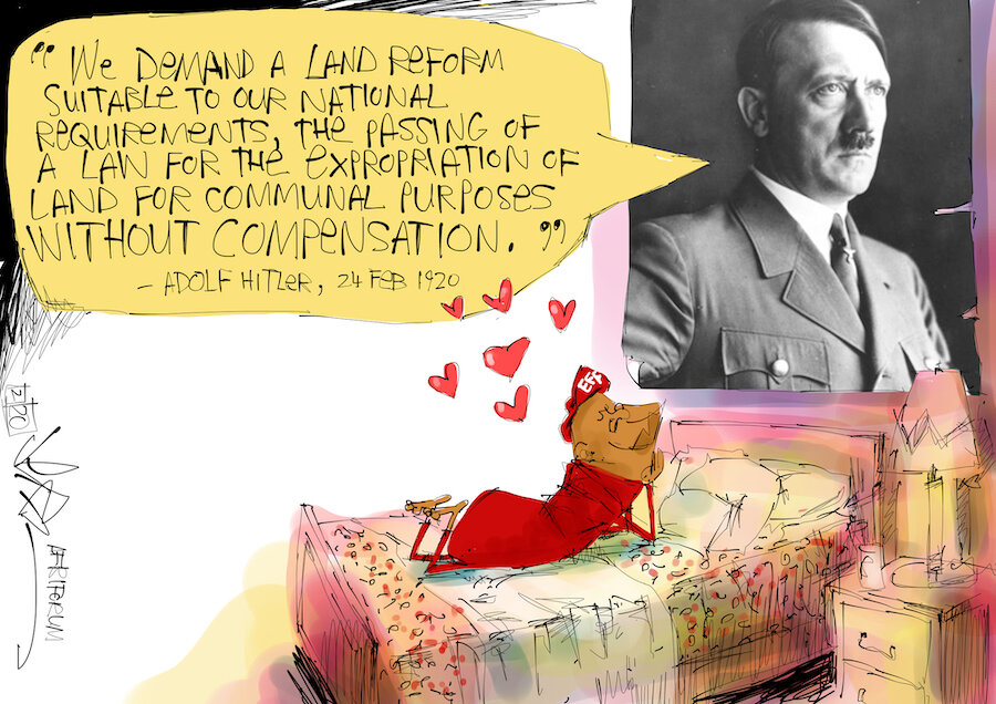 The politics of pain again, and it rears itself throughout the ‘Struggle’ years – injustice, pain and trauma caused to the Black population by the Apartheid state – and by the ‘white settlers’ not part of nation’s soil – foreigners, seeking to exploit their minerals and labour. To overcome this was the need to for a unified black consciousness who when it comes to power will seek to usurp its power over anything that would threaten the ‘Mzanzi’ Nation – a term now firmly entrenched in the South African national identity and lexicon. The penalty for ‘Apartheid’ – land and capital appropriation without compensation from the ‘white’ owners of it (in much the same way Nazi Germans appropriated through the same legislation – land and capital belonging to Jews).