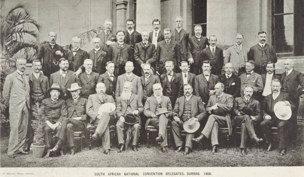 Front row (left to right): Hon. J.W. Saner, (Commissioner for Public Works); Hon. J.X. Merriman, (Prime Minister, Cape Colony): Hon. M.T. Steyn (Vice-President of Convention); Hon. A. Fischer, (Prime Minister, Orange River Colony), Lord J.H. de Villiers (President of the Convention), Right Hon. General Louis Botha, (Prime Minister, Transvaal); Right Hon. F.R. Moor, (Prime Minister, Natal), Sir W.H. Milton (Administrator of Southern Rhodesia), Sir J.P. Fitzpatrick.