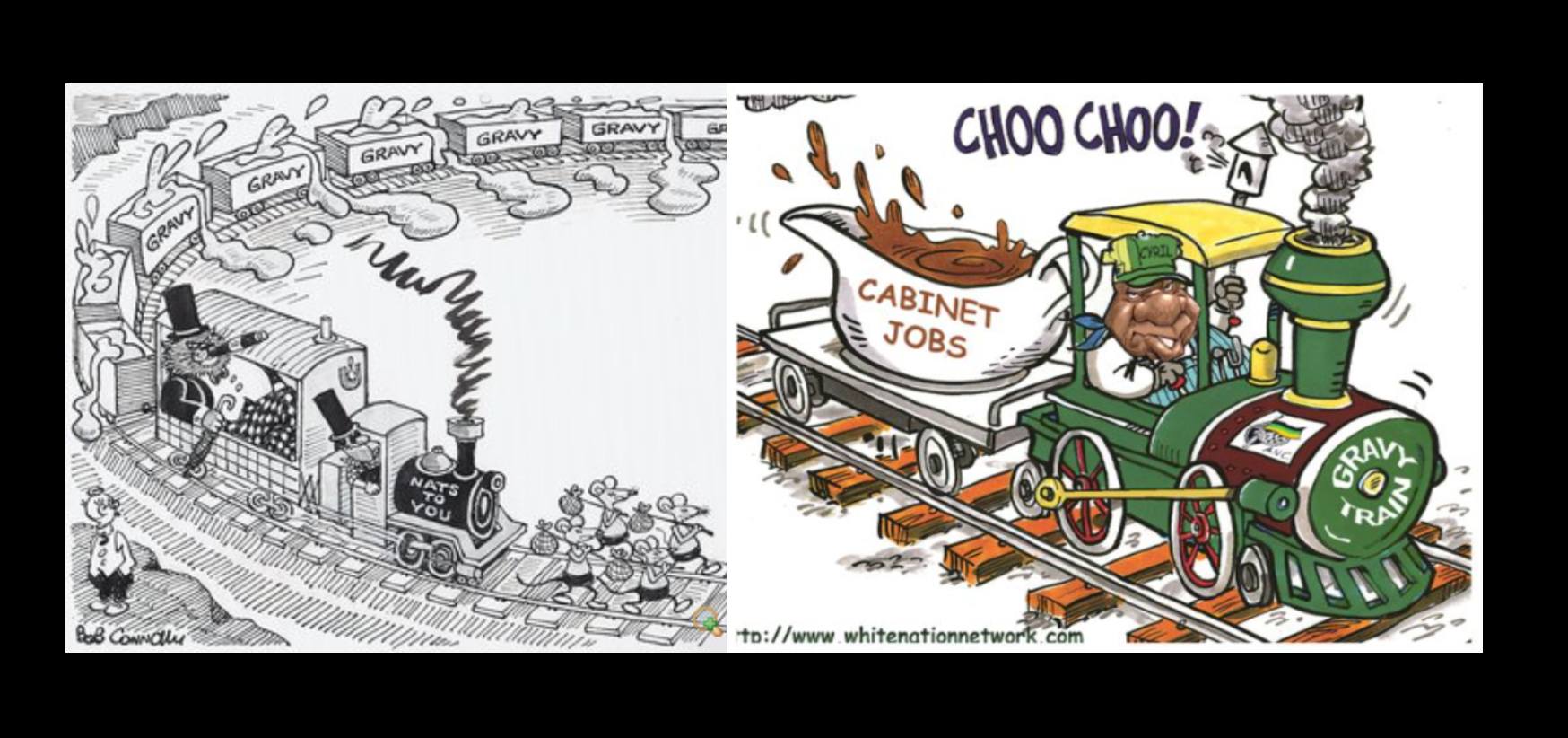 On the left is a political cartoon from the 1950’s by Bob Connolly – it’s part of a series called “Fat Nat” and targets the National Party’s appetite for Kleptocracy – as does the political cartoon on the right lampooning President Ramaphosa and the ANC.