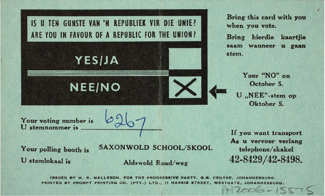 On the Cape Coloured Franchise, The Separate Representation Act as put forward by the National Party in 1951 went ahead after the National Party overcame the powers of the judiciary through packing it to by-pass the constitution. The ultimate removal of the Cape Coloureds (some 50,000 voters) from the Common Voters roll in 1956 would pave the way for future and more sinister racially based Apartheid legislation, the complete marginalisation of ‘black’ political representation and it would open the way to the National Party’s dream of a Referendum to take South Africa out of its British Dominion and ‘Union’ status completely to become a White Afrikaner Republic.