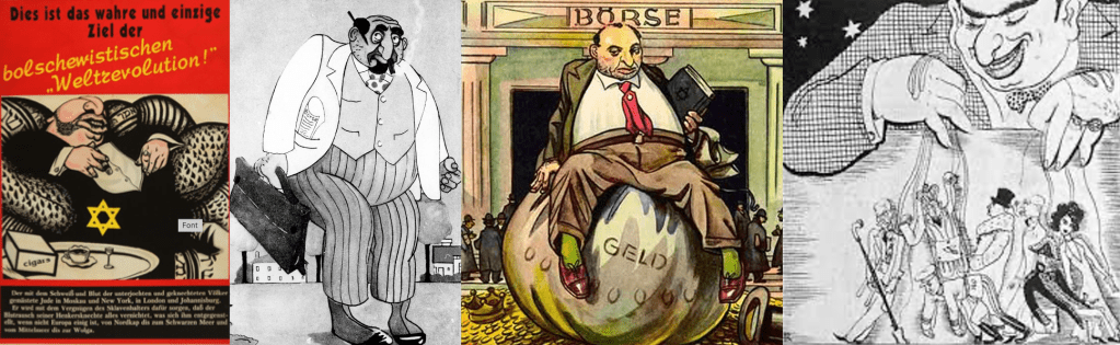 Images: Nazi period demonisation of Capitalist Jews, known as the ‘banker’ – depicted as fat, cigar smoking, balding and greedy – either pulling the strings or holding onto the money bag .