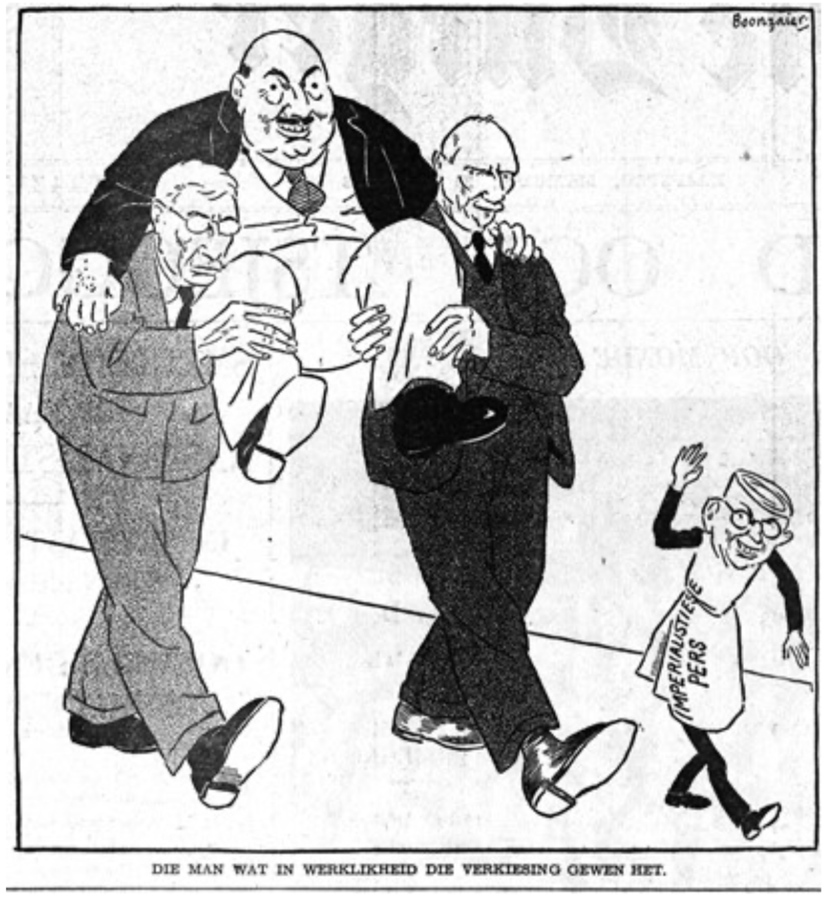 The caption alludes to ‘Jewish Capital’ as the real winners of the election and Hoggenheimer’s finance the sinister reason behind D.F. Malan’s defeat, the winners – the United Party – a puppet in servitude to its Jewish master, and the image also alludes to the “Imperial” i.e. English press as leading the way.