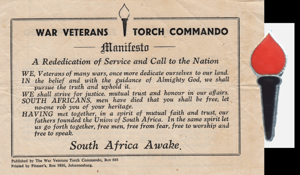 The ‘smoking gun’ for the ‘white struggle against Apartheid’ begins in earnest with a military theme and a post-World War 2 military veteran’s formation. The Torch Commando, a mass movement of mainly white ex-servicemen and supporters who mobilised against Apartheid; 250,000 in total. Not a common feature on South African history of the ‘Struggle’ – simply put it does not suit the current political rhetoric and broad popular understanding of the ‘struggle’ – so how did this come about?