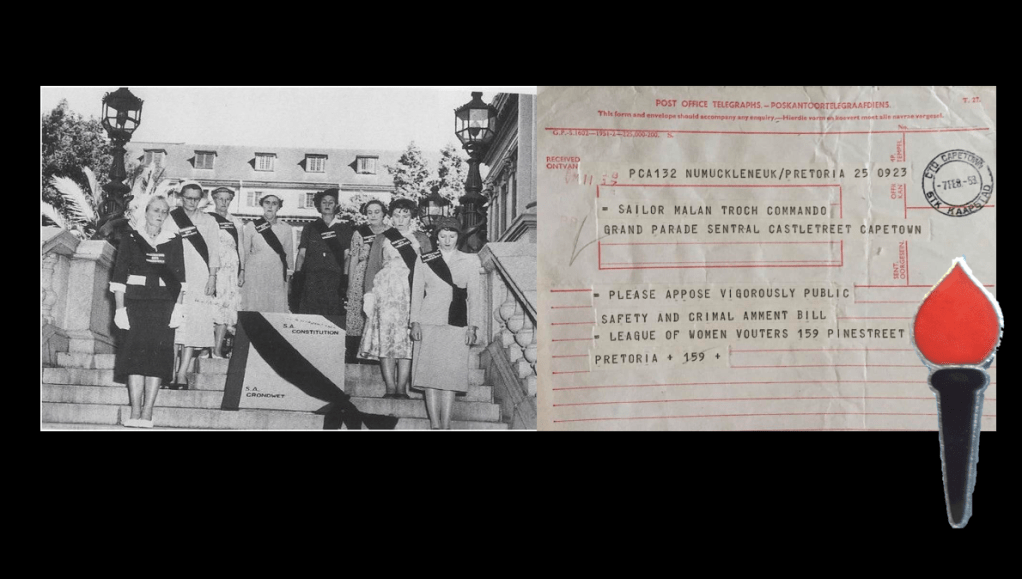 In a nutshell, The Torch Commando mission came on the back of a ‘Constitutional’ (not majority win) of the National Party in 1948 to push for another more representative election and The Constitutional Crisis’ that follows the Afrikaner Nationalist government’s first attempts at Apartheid legislation. The Torch views its fight as an extended anti-fascism one against ‘the rise of the Afrikaner Reich’ and sees a quarter of the 1948 ‘White’ voting base (of an est. 1,000,000), known as the ‘service vote’ – actively mark their protest against the National Party’s accent to power in a mass ‘pro-democracy’ and ‘anti-Apartheid’ movement.