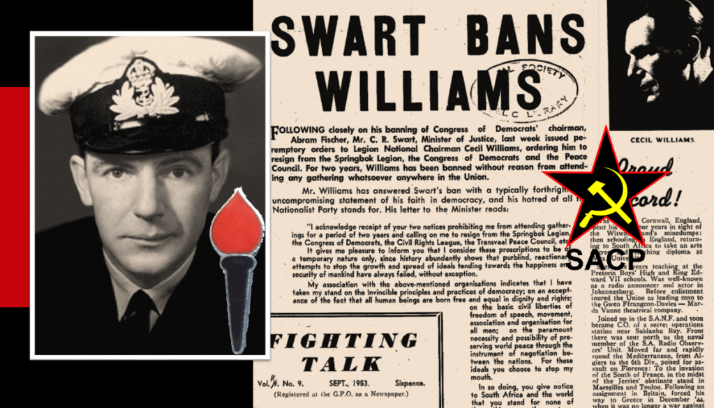 Cecil Willams’ wartime experience was with the Royal Navy (RN) as a RN War Correspondent in the Mediterranean theatre. He joins The Springbok Legion as its Secretary and later becomes its Chairman. A paid-up Communist Party of South Africa (CPSA) member, he becomes the administrative officer of the Torch Commando’s “Steel Commando”.