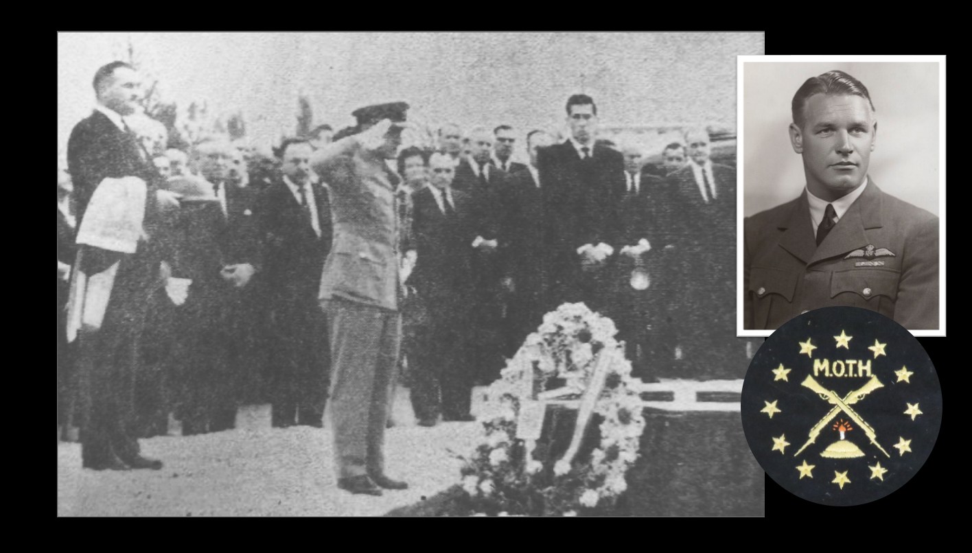 Image: Here Wing Commander J Moss of the Royal Rhodesian Air Force pays his tribute to Sailor Malan. It also did not stop the Memorable Order of Tin Hats (MOTH), of which Sailor was a member from giving him the rites afforded a MOTH member. Behind Wing Commander Moss stands MOTH Francis John Dressler, a fellow WW2 vet, with the MOTH flag over his arm and a Brodie helmet (Tin Hat) in hand – the MOTH flag was subsequently draped over the coffin. As per MOTH ritual a candle would have been placed on the helmet and lit as a flame of remembrance.