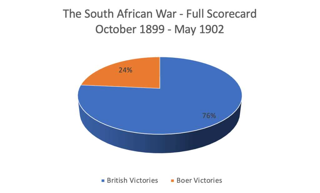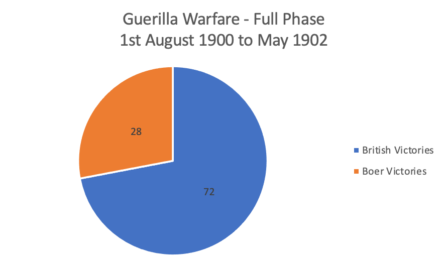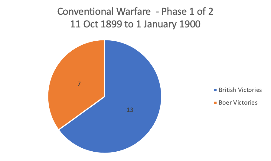 Overall, for the ‘Conventional’ war phase, the balance is overwhelming in favour of the British – British win 58 and the Boers win 12. In terms of timing, the British victory in the Conventional Phase is swift – from October to July – a mere 10 months, they have reversed an invasion, captured two separate countries, taken both Boer Republic’s capital cities, taken the Boer’s economic hub, isolated both countries and starved them of external aid. Broken the critical mass of the enemy to fight conventionally, taken nearly every major gun and artillery piece, and occupied all the enemy’s fortifications and defences. By any military standards that is good Command – Strategic, Tactical and Operational.