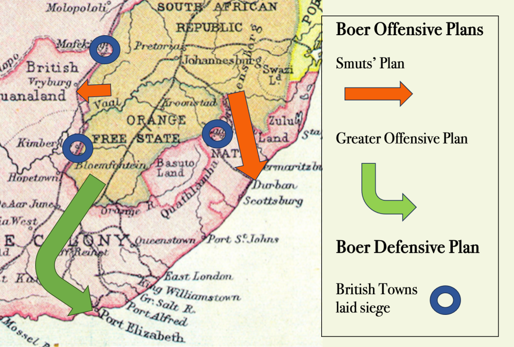 Smuts’ offensive plan also does not propose laying anything to siege, surrounding and laying either Ladysmith, Kimberley or Mafeking is avoided entirely, he is far more concerned with speed and a quick win before Britain can reinforce anything – especially Natal and Durban which Smuts targets his ‘seat of war’. The rapid seizing of Durban whilst its relatively lightly defended is important to Smuts, without seizing it the British will be able to reinforce and counter-attack – so the taking of Durban will either make or break the plan.