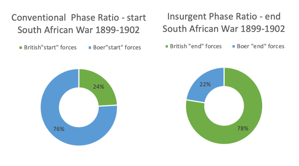 In terms of military doctrine, the above estimation is about right – to invade the British territory the Boers need a 3 to 1 advantage to be successful and to counter attack and hold the Boer territory the British need to be at a 3 to 1 advantage – and even by Guerrilla Warfare standards and the doctrine used to fight one, this number is very low. Consider the following: