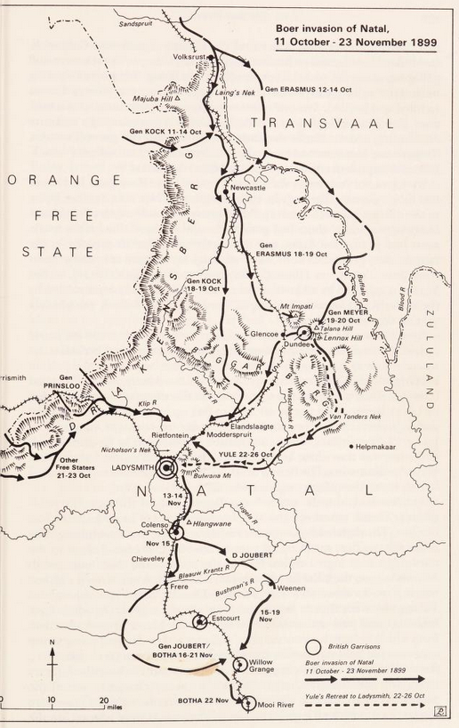 Look at it from the perspective of military doctrine, the Boer “start line” is Volksrust on the border near Laing’s Neck – a most formidable defence position on the border of Natal and the “gateway” to both the ZAR and Natal, home to Majuba mountain and Laing’s neck, where the British were so soundly beaten by the Boers in 1881 – it’s a proven natural defence and one which the British could not breach just 18 years earlier.