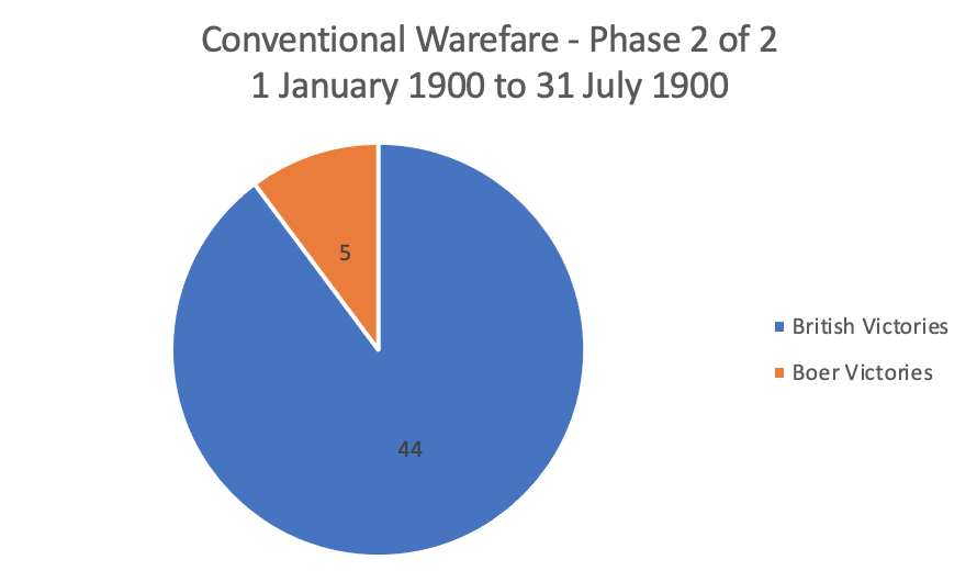From 1st January to July 1900, the numeric components start to balance, however on a Operational and Tactical level conducting conventional combined arms – the advantage swings significantly to the British. All the major sieges are relieved, the Boers invasions are turned and they are ejected from the British colonies. The hunt into the Orange Free State decimates the fighting capability of the Boers and forces the surrender of their conventional fighting capability. During this phase 49 actions are fought – the Brits win 44 and the Boers win just 5.