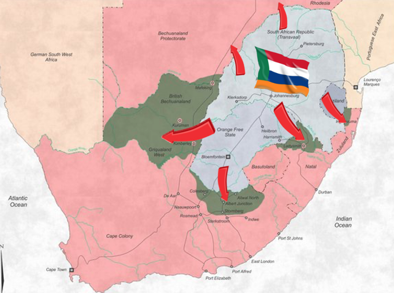 In the end, both ends of the British argument are 100% correct. Milner is 100% correct, the ZAR is a significant destabiliser in the area with territorial ambitions over Swaziland – which they annex, Rhodesia (the Adendorff trek and the Matabeleland concession) and Zululand for access to a Natal based seaport at St Lucia. President Steyn in the OFS also has territorial ambitions over Griqualand and the diamond fields in the Cape Colony.