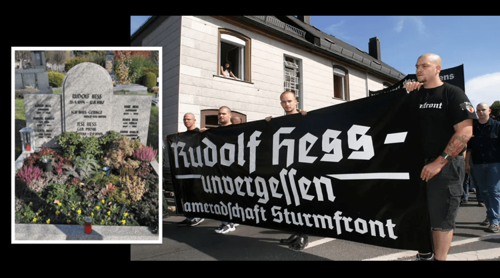 Problem was – as the only real grave marker to a Nazi leader from the inner circle, each year on the anniversary of his death, neo-Nazis far right extremists from all over the world attempted to stage a march to the cemetery and salute the grave and gravestone epitaph “Ich hab’s gewagt” (“I have dared”). This despite court rulings banning it, causing the town to be shut-down with heavy police presence. It became such a menace, that when the graves lease expired 2001, the Hess’ remains were removed and cremated, the headstone removed and destroyed, and Hess’ ashes were scattered at sea by his surviving family.8 A move which was welcomed by the good people of Wunsiedel and just about every civic association and the Jewish German community. Even Spandau prison was demolished entirely to prevent it becoming a Neo-Nazi shrine.