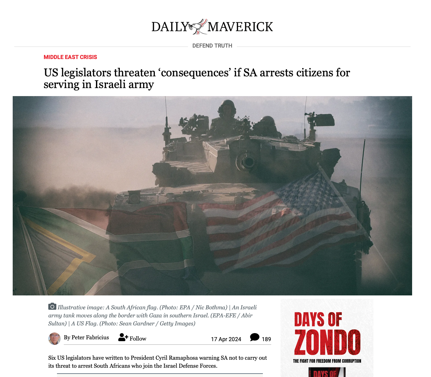 Daily Maverick: US legislators threaten ‘consequences’ if SA arrests citizens for serving in Israeli army – By Peter Fabricius 17 April 2024 ↩︎