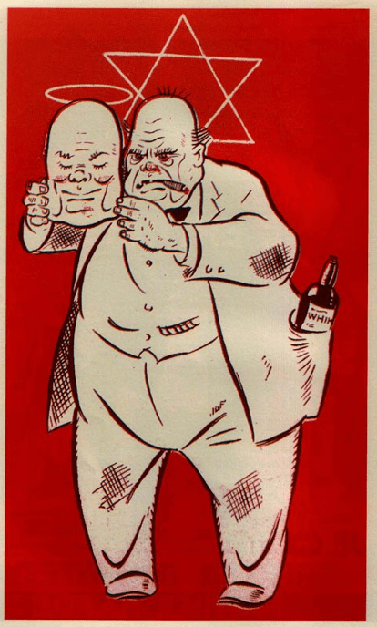 In another propaganda poster – this one from Serbia during World War 2, called ‘Churchill behind the mask’. After taking off his mask shown to the public, halo and all, a Jewish star now above his head and showing a drunken, haggard face and whiskey bottle in his pocket.