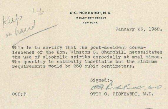 Very famously, Churchill was knocked down by a car New York in 1931 during the American Prohibition 1920 – 1933 on alcohol (he was looking the wrong way), Dr. Otto C. Pickhardt attended to him, actually issued a medical note that Churchill’s medical condition “necessitates the use of alcoholic spirits especially at mealtimes,” specifying 250cc per day as the minimum. A little cheeky to overcome the rigours of Prohibition perhaps, but this is not a sign of dependency – 5 years after this incident in 1936 he took a bet with Rothermere that he could abstain from hard spirits for a year – which apparently he did.11