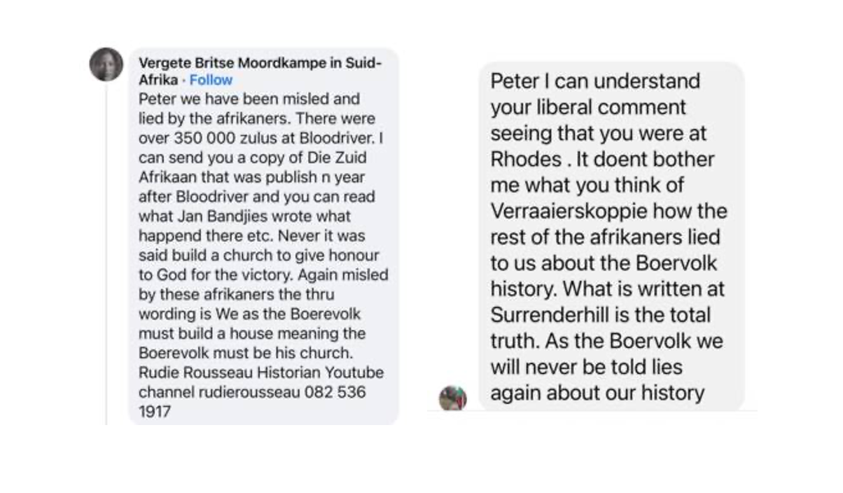 Then there’s these gems from Rudi Rousseau, I took on one of his acolytes in a Boer War group and the next minute a PM appeared in my mailbox. I maintained that Rousseau, who is a self appointed historian for “Boere media”, defaced the monument at Surrender Hill in the Free State when he cemented a granite plaque to it which called the surrendering Boere “verraaiers” (traitors) and absolved Christian de Wet of abandoning his command – his action really no dissimilar to any defacing of a war memorial and as unhinged. The next one relates to a Blood River post, and Rousseau is so conflated with mythology and the idea of a “super-Boer” that he honestly believes a handful of Boers fought off 350,000 Zulu at the Battle of Blood River in 1838 – as stated earlier this kind of thing is not unusual in some circles.