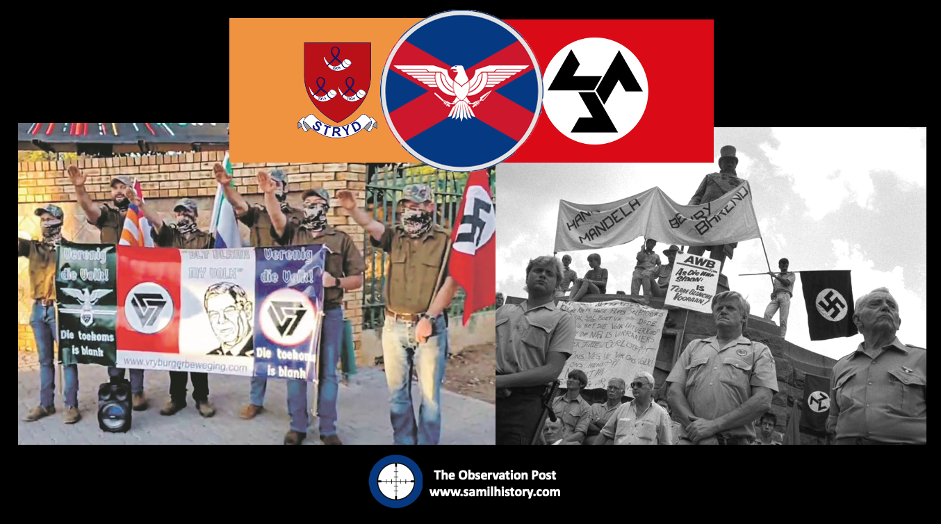 In terms of historic sweep, from the implementation of Apartheid in 1948, as a derivative of Nazism comes this idea of a police state to command and control a ‘whites only’ Afrikaner led hegemony over all South Africans – an oligarchy of minority rule with brutal state security apparatus, highly centralised government and a ‘command economy’ to maintain this status quo. This under-pinning Nazi philosophy eventually manifesting itself in various ‘Boerenasie’ and Afrikaner resistance movements (the AWB et al) starting in the mid 1980’s and its still lurking in South Africa to this day as a minority counter culture demanding a ‘Herrenvolk’ populated ‘Volkstaat‘ in places like Orania, and it can also still be found in various security services, political parties, cultural movements, historical reenactments and the internet. To illustrate the point, the Herstigte National Party still exists in South Africa, believe it or not, the extreme right wing party with its proto-Nazi origins everyone tries to forget. It has lost its ‘ticket’ but still exists and its stated mandate is the return of Verwoerdian Aparthied, and there are others like it.