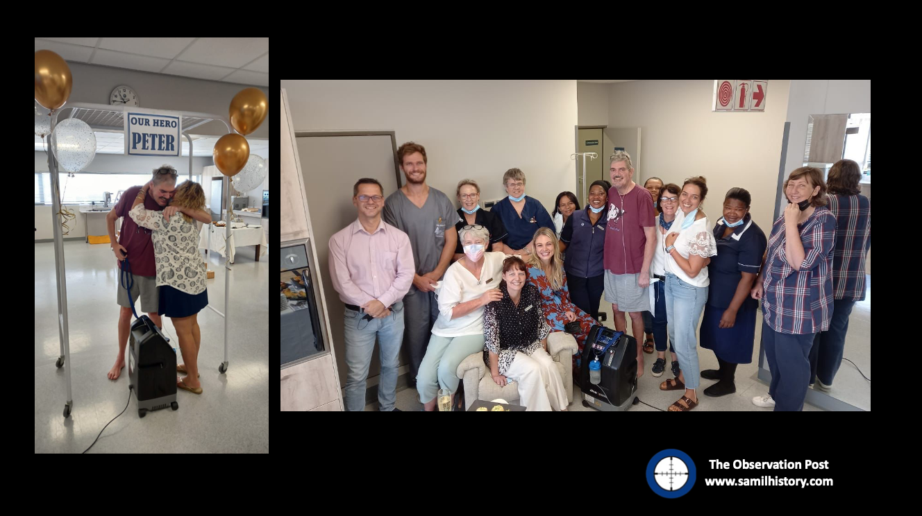 However, by Armistice Day – 11th November 2021, almost miraculously as all my limbs were still swollen from infection and I had no “A line” my vein structure non existent – things actually started to look up on my infection markers and Oxygen SATS. The artificial trachea was removed, my voice box re-attached, and I was finally moved from ICU into a ‘High Care’ ward (in all I had spent 110 days in Intensive Care Units), still on high flow Oxygen and very frail. However I was now off the ventilator – in all I hold the record at Tygerberg for being on a ventilator – a first prize I didn’t intend winning.