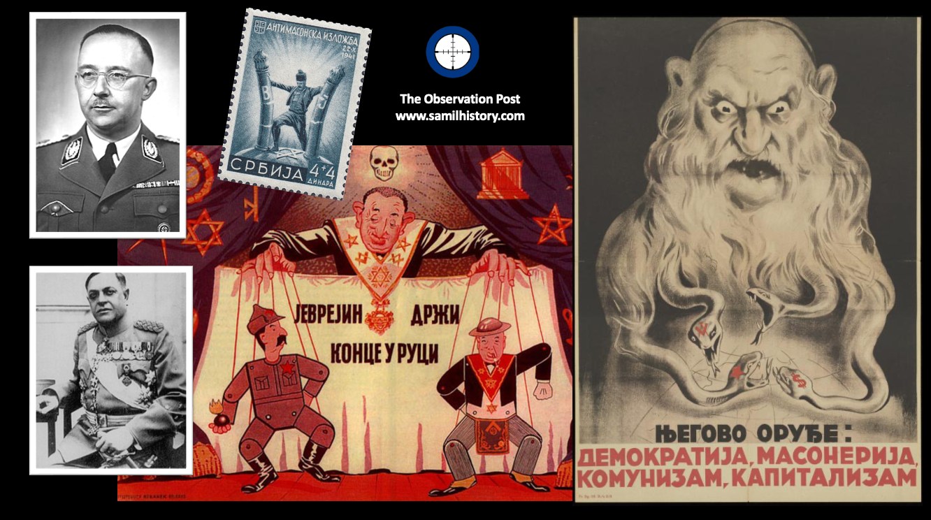 One of the most infamous foreign exhibitions was the The Grand Anti-Masonic Exhibition, opened in Belgrade, in occupied Serbia on 22 October 1941. Financed by the Germans and opened with the support of collaborationist leader Milan Nedić it featured an estimated 200,000 brochures, 108,000 copies of nine different types of envelopes, 100,000 flyers, 60,000 copies of twenty different posters, and 176 different propaganda films that had previously been seen during ‘The Eternal Jew’ exhibitions in Munich and Vienna in 1937. Although being anti-Masonic in its title, the primary purpose was to promote antisemitic ideology using the Protocols of the Elders of Zion to rationalise and intensify hatred of Jews.