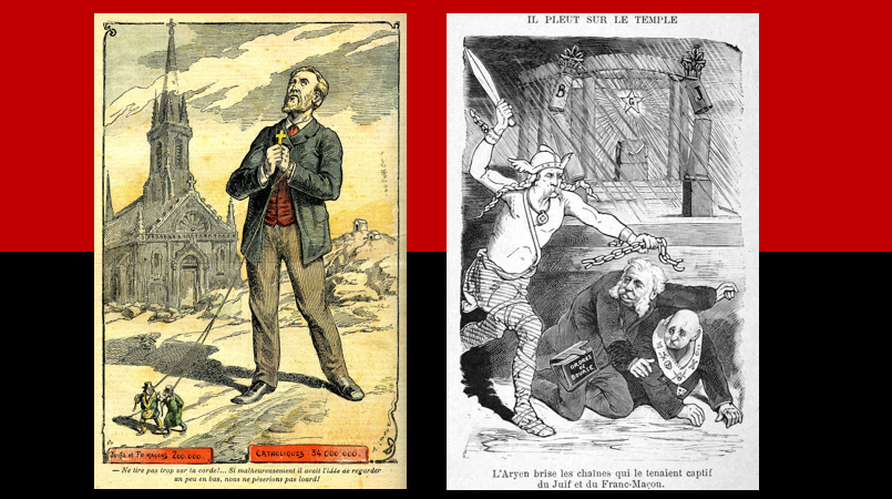 On the left is a poster which shows an international Freemason and Jewish conspiracy (involving only 200,000 Jews and Masons) leading innocent and God fearing Catholics (the majority 34,000,000) to their nefarious ends. On the right is a French poster, very much in Nazi lore, which shows the pure ‘Aryan’ warrior striking the chain bonds of the Jew being held captive by the Freemason.