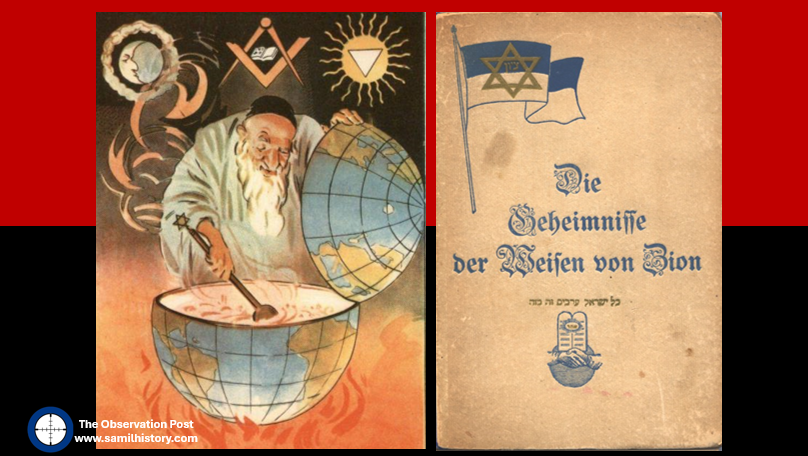 The Protocols of the Elders of Zion, also known as ‘The Protocols’ are a fictional work, it’s a combination of a number of documents targeting Jews primarily, but also Freemasonry. It purports to be the minutes of meetings of 24 speeches made by Jewish leaders during the First Zionist Congress in 1897. It actually had its roots as early as the 1860’s in a anti-Napoleon III pamphlet and became a forged rational for the Russian pogroms against Jews. By 1903 the Protocols appeared as an appendix in an anonymous Russian antisemitic pamphlet called The Great Within the Minuscule and Antichrist. The ‘Protocols’ eventually found their way into a German antisemitic book called The Secrets of the Wise Men of Zion – the first documented version of ‘The Protocols’ published outside of Russia and published in Charlottenburg, Germany in 1920 – which was subsequently read and used widely by Hitler and the Nazi Party in Germany.