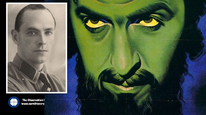 The second poster shows the Jews and Masons controlling the Soviet Union and the United Kingdom, with marionettes of Stalin and Churchill, also depicted as a Freemason (it’s unrelated but in fact he was a mason for a short time). The caption reads: “The Jew is holding the strings. Whose strings and how? He’ll answer you. The anti-masonic exhibit”.