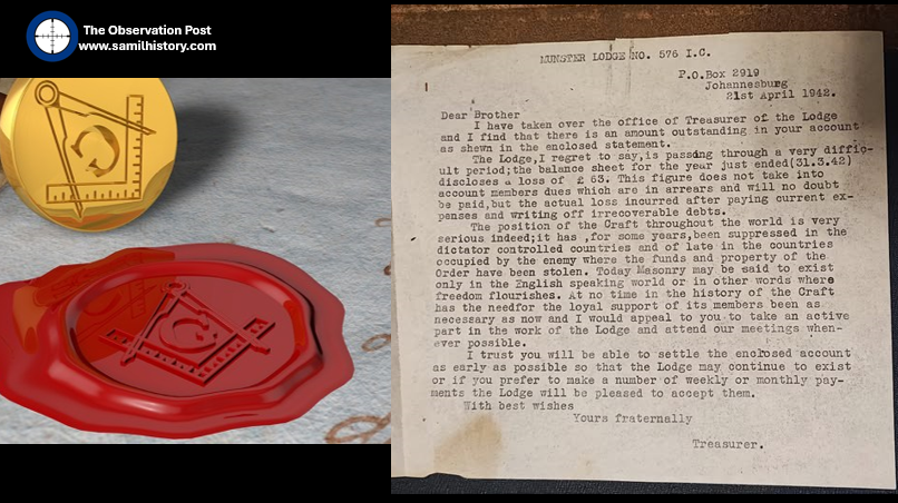 In South Africa the Freemason fraternity would endure their remembrance duties and lament the situation in Europe, here is interesting piece of Masonic lore at Kensington Masonic Hall. It comes from Munster Lodge Irish Constitution and essentially it is a letter between a Brother and the Treasurer regarding the non-payment of his dues, it is written on the 21st April 1942 mid way though the war. It gives a grave picture of Masonry world-wide and in the occupied countries and urges the need to retain membership against difficult times. A second letter, also held at the Kensington Masonic Hall, is a set of minutes and funds raised for the family of a Freemason killed in action.37