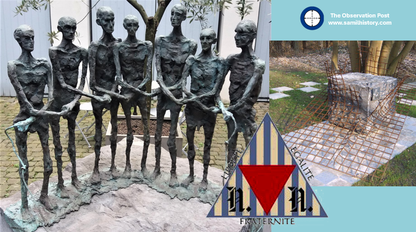 The first and more famous lodge was the Liberté Chérie or Beloved/Cherished Liberty Lodge one of very few lodges founded inside a Nazi concentration camp. It was established inside Hut 6 at Esterwegen (a political prisoner concentration camp). Founded November 1943 by 7 Belgian Freemasons and resistance fighters. During its existence it ‘Entered’, ‘Passed’, and ‘Raised’ at least 2 additional members. A memorial and sculpture is now part of the memorial site of the Esterwegen Cemetery.33