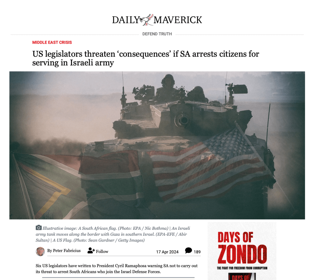 - Daily Maverick: US legislators threaten ‘consequences’ if SA arrests citizens for serving in Israeli army – By Peter Fabricius 17 April 2024 ↩︎