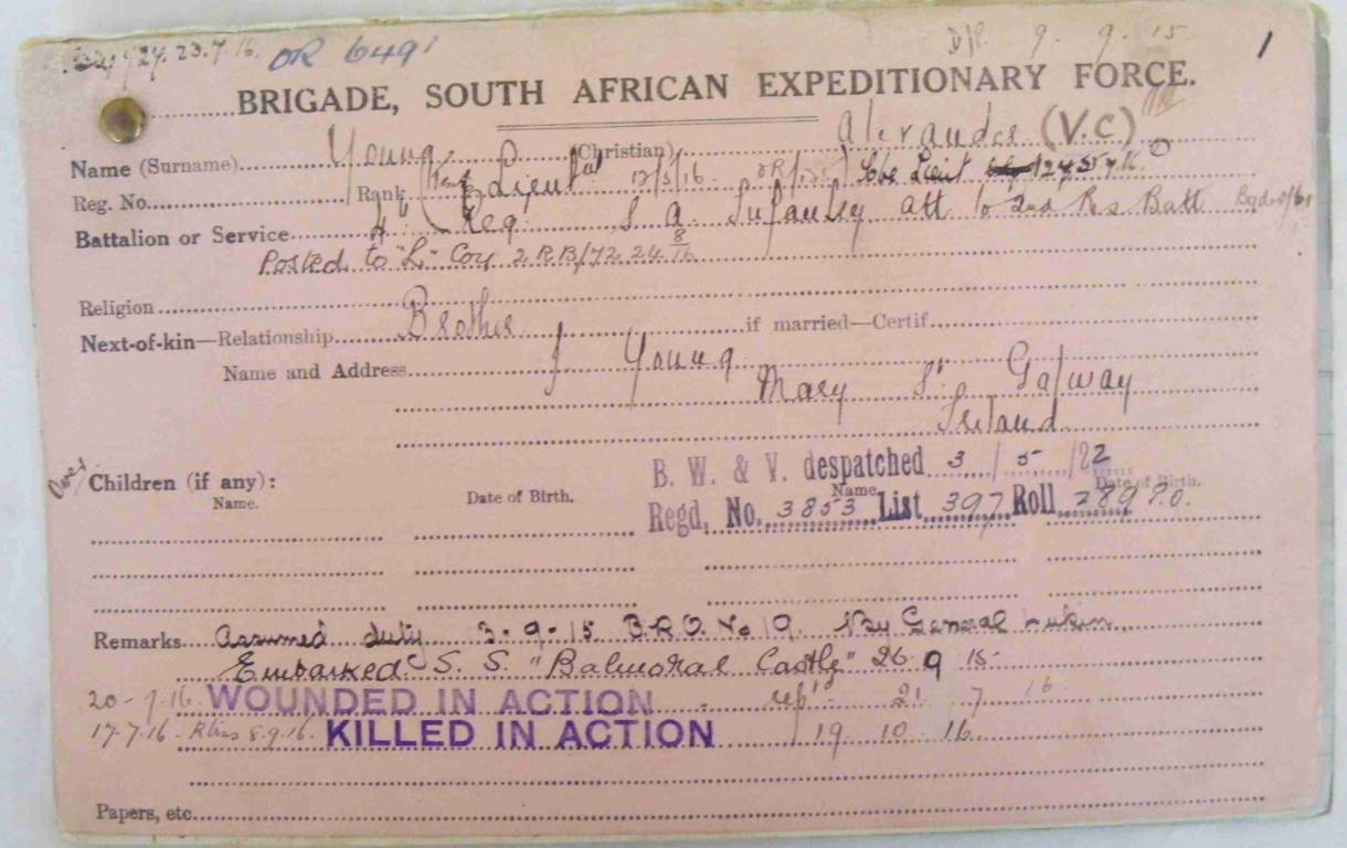 All that aside, Alexander Young VC was a South African to his bones and an incredibly brave one at that – not only fighting for the British Army, but also fighting as Cape Colony Mounted Policeman as their Regimental Sergeant Major and then ultimately fighting as a Commissioned Officer in the Union of South Africa’s forces during World War 1. He saw action and served in India, Egypt, Sudan, Zululand, South Africa, German South West Africa, East Africa and France – his impressive array of decorations and medals include: The Victoria Cross, The Queen’s South Africa medal, The King’s South Africa medal, The Zulu Rebellion medal and then his three WW1 medals – The 1914-1915 Star, British War Medal, and the Victory Medal.