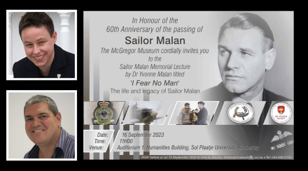On the 16th and 17th September 2023, Peter Dickens from the South African Legion was invited to attend the 60th anniversary of Sailor Malan’s passing in Kimberley by the Malan family. Two events were held, a memorial lecture by Dr Yvonne Malan (a distant relative of Sailor’s) at Sol Plaatjie University (SPU) was held on the 16th September and was hosted by the McGregor Museum and Sol Plaatjie University.