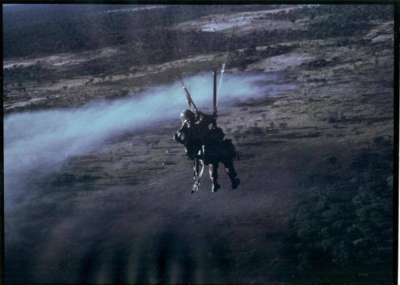 At 08:04, 367 SADF ‘Parabats’ (Paratroopers) were dropped from 6 aircraft. Due to the reconnaissance photo scaling error, and obscured pilot visibility of the tracking and distance markers (caused by smoke from the bombing) the drop was a shambles. Nearly all paratroopers did not land on the intended target zone, many been scattered into positions that put them into serious danger. Some dropped right on top of the enemy, some landed kilometres away from their intended positions, some in trees, some into tall maize fields, others into the river and some on the wrong bank of the river.